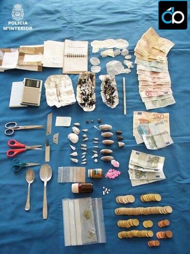 En el registro domiciliario que se llevó a cabo con la preceptiva autorización judicial, se intervinieron   70 gr. de hachis (7 bellotas y media), dos frascos casi completos de “Trankimazin” y “Tranxilium” respectivamente,   9.1 gr. de cocaína, 4.5 gr. de heroína,   2.6 gr. de mezcla heroína-cocaína y 20 papelinas de mezcla listas para su distribución, además de útiles para la distribución, elaboración y venta, tales como báscula de precisión, tijeras, recortes circulares de plástico para las papelinas y 508.98 € en efectivo.