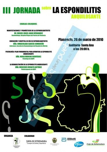 El próximo viernes 26 de marzo, la Asociación Extremeña de Pacientes con Espondilitis Anquilosante, AEXPE celebrará en Plasencia las III Jornadas sobre Espondilitis Anquilosante. Tendrá lugar en el Auditorio Santa Ana a las 20:00h.