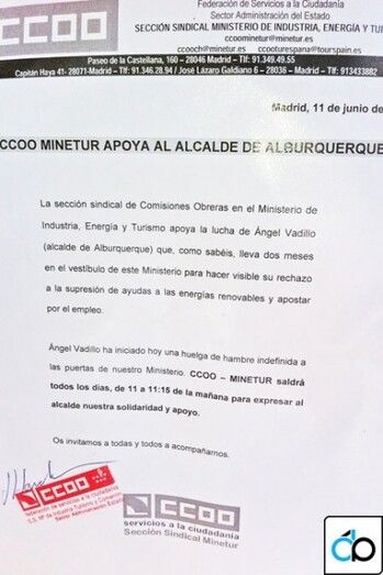 Asimismo, como anunciaron en un comunicado el mismo día que Ángel Vadillo inició la huelga de hambre: “la sección sindical de Comisiones Obreras en el Ministerio de Industria, Energía y Turismo apoya la lucha de Ángel Vadillo, alcalde de Alburquerque, que, como sabéis, lleva dos meses en el vestíbulo de este Ministerio para hacer visible su rechazo a la supresión de ayudas a las energías renovables y apostar por el empleo. Ángel Vadillo ha iniciado hoy una huelga de hambre pacífica e indefinida a las puertas de nuestro Ministerios. CCOO-MINETUR saldrá todos los días, de 11:00h a 11:15h de la mañana para expresar al alcalde nuestra solidaridad y apoyo. Os invitamos a todas y todos a acompañarnos”.