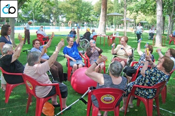 Durante toda la mañana las personas mayores están desarrollando una amplia y continua actividad, estimulando los sentidos, utilizando herramientas como pesas, pelotas gigantes y medicinales, paracaídas y aros, entre otros.