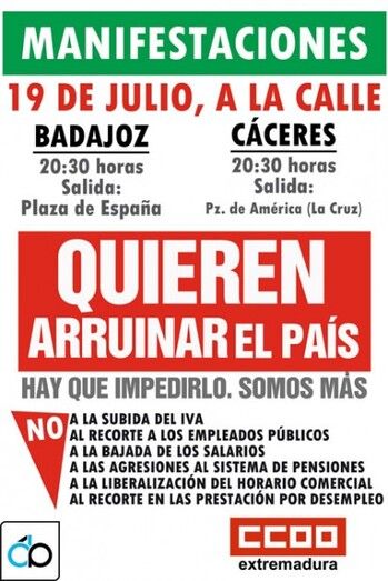 CCOO convoca para el día 19 de julio dos manifestaciones simultáneas en Cáceres y Badajoz.