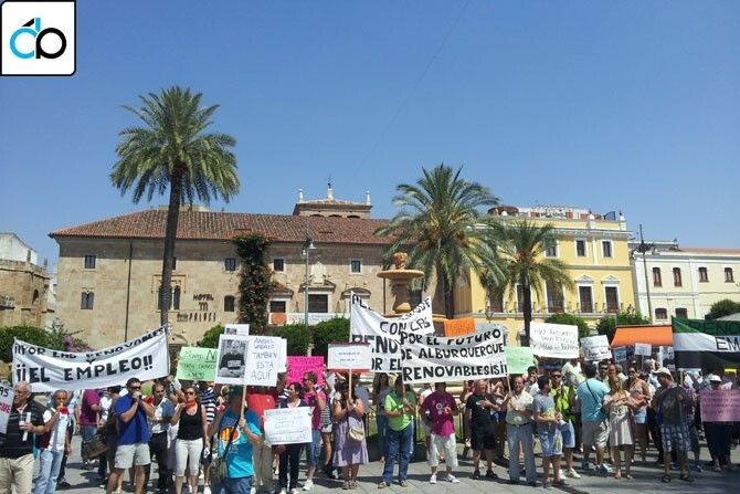 Esta mañana cientos de alburquerqueños se manifestaron en la Plaza de España de Mérida, ante la Presidencia del Gobierno, para mostrar todo su apoyo a la reivindicación que está llevando a cabo su Alcalde por un futuro digno para los ciudadanos. Con pancartas como “mi Alcalde lleva 38 días en huelga de hambre por el empleo y las renovables en mi tierra” o “Ángel Vadillo también está aquí” se unían a la reivindicación de su Alcalde reclamando las renovables “entendemos que el sector de las renovables puede y debe ser la locomotora económica de Extremadura. Por ello, los ciudadanos no podemos permitir que los intereses de unos cuantos (UNESA) prevalezcan, con el beneplácito de nuestros representantes políticos, sobre el beneficio de todos y cada uno de los extremeños”.