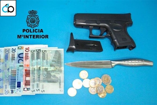 Rápidamente los agentes realizaron una coordinada inspección por la zona y alrededores a fin de localizar al supuesto autor del hecho, consiguiendo la misma en la Estación de Autobuses de esta ciudad, procediendo a su detención, incautándole en el cacheo realizado una pistola simulada, la que supuestamente utilizó para el ilícito penal descrito. Igualmente se le incautó un cuchillo de cocina de 12 cms.