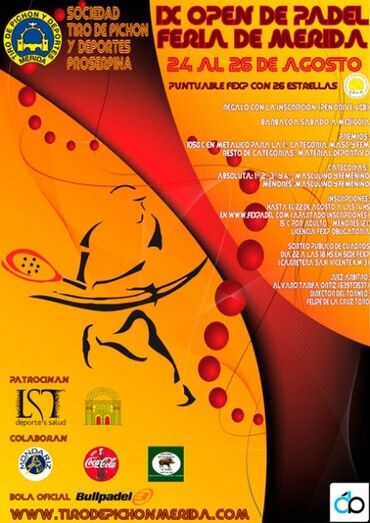 Del 24 al 26 de agosto, en las instalaciones de la Sociedad Tiro de Pichón y Deportes "Proserpina", de Mérida se celebrará la IX edición del OPEN DE PADEL "FERIA DE MERIDA" en masculino y femenino. Se jugará en cuatro categorías siendo todas ellas federadas y puntuables para el ranking extremeño con 26 estrellas.