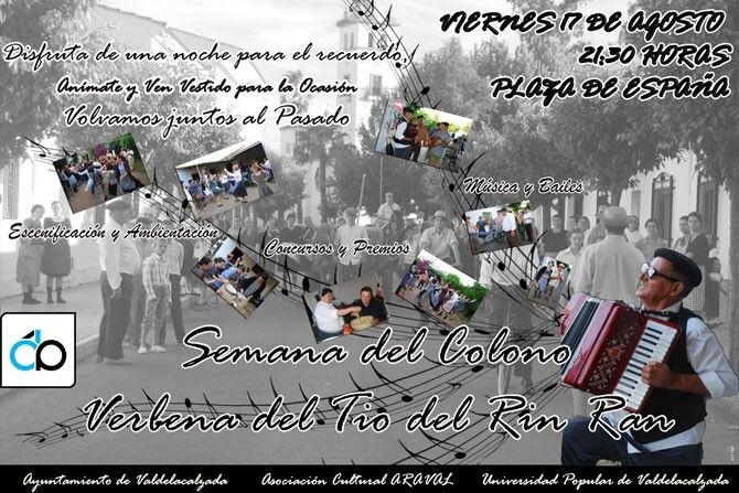 Para ello el Ayuntamiento de Valdelacalzada desde su Universidad Popular y conjuntamente con el apoyo de la Asociación ARAVAL y Vecinos, han programado desde el 13 al 19 de Agosto, la III Semana del Colono con diferentes actividades destinadas a difundir el patrimonio humano de los cientos de hombres y mujeres que construyeron la historia social de este pueblo de colonización.