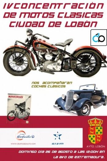 El próximo día 26 de agosto, a las 12:00h, tendrá lugar la IV Concentración de Motos Clásicas Ciudad de Lobón en la Avenida de Extremadura de dicha localidad.