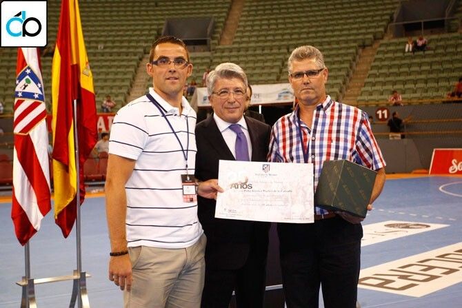 Dos miembros de la Junta Directiva de la Peña Atlético de Madrid de Puebla de la Calzada, el presidente, Manuel Zamora y Vicente Moruno, tesorero, recogieron un diploma acreditando los 25 años de su existencia y fidelidad del Club Atlético de Madrid de manos de su presidente Enrique Cerezo.