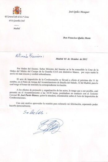 El día 11 de octubre el Excmo. Señor Don Arsenio Fernández de Mesa, Director General de la Guardia Civil en el acto institucional celebrado en el acuartelamiento de la 1º Zona de la Guardia Civil, con sede en Madrid durante el tradicional acto castrense con motivo de la celebración de la festividad de Nuestra Señora La Virgen del Pilar, ha impuesto la medalla a la Orden del Mérito de la Guardia Civil con Distintivo Blanco a Francisco Quílez Morte, Presidente Nacional de la Federación de Asociaciones de Antiguos Guardias Civiles Auxiliares de España, el cual ha sido acompañado por el Vicepresidente 1º Nacional Fernando Sanandrés Sánchez y los representantes de la Asociación de Antiguos Guardias Civiles Auxiliares de Madrid José Lorenzo López Roncero y Juan José González Muñoz.