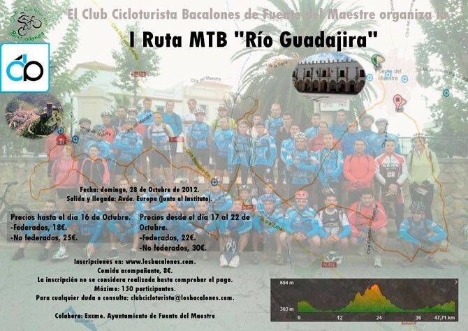 El Club Cicloturista Bacalones, en colaboración con el Ayuntamiento de Fuente del Maestre (Badajoz), ha organizado la I Ruta MTB Río Guadajira, que tendrá lugar el día 28, a las 09:00 horas desde la Avenida de Europa (junto al Ies. Fuente Roniel). En este lugar, se recogerán los dorsales obligatorios desde las 07:00 horas.