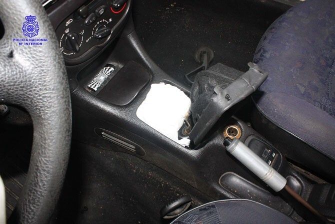 Al inspeccionar el interior del vehículo que conducía, hallaron bajo la carcasa de la palanca de cambios una bolsa de plástico que contenía un total de 250 gramos de cocaína en forma de roca y algo de polvo, procediendo a su inmediata detención.