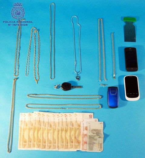 Comisionados agentes policiales al lugar de los hechos, se entrevistaron con el requirente, el cual aportó características de la mujer, realizando una minuciosa inspección de la zona y alrededores ya que en las proximidades del lugar se ubican varias joyerías, siendo localizada una mujer de las características aportadas, por lo que se identifica y se le intervienen varias piezas de oro falso envueltas en papel con un número inscrito, procediendo a su detención, manifestando la detenida que había sido acompañada por dos hombres, por lo que se procede a un amplio despliegue policial por la zona , localizando un vehículo ocupado por dos individuos, siendo identificados y observando como uno de ellos antes de bajar del vehículo arroja un envoltorio de papel debajo de su asiento, comprobándose que contenía varias piezas de oro falso, interviniéndoles además 669 euros, 3 teléfonos móviles y una bolsa con varias prendas de vestir.
