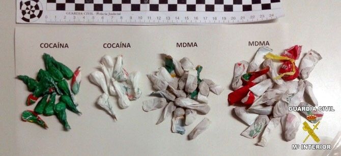 Tras la identificación y minucioso registro del vehiculo, los agentes hallaron ocultas en los habitáculos de la palanca de cambio y freno de mano, 64 papelinas de cocaína, MDMA (droga de diseño) y 17 gramos de marihuana preparadas para su venta.