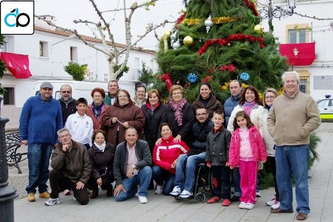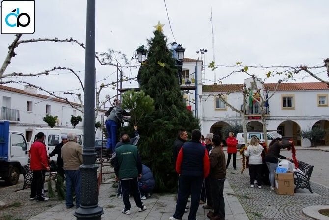 Las Asociaciones de Guadiana del Caudillo se reunieron en la Plaza Mayor de la localidad para confeccionar el árbol de Navidad que se exhibe en la plaza durante estas fiestas.