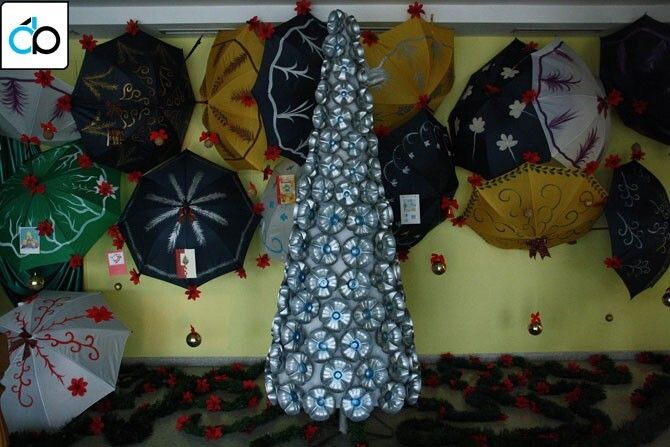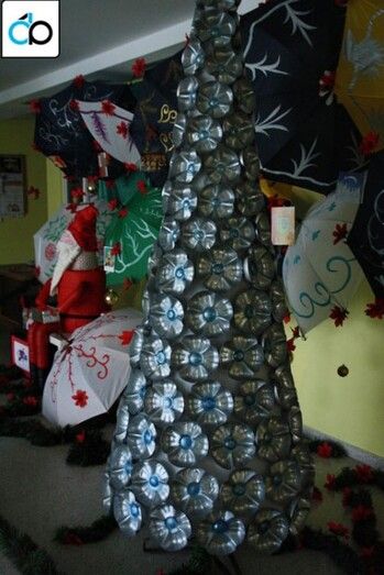 Usando un cono de hierro y alambre, confeccionado por Pedro Mateo, pintura para embellecer el plástico, tela y silicona, se ha cubierto toda la superficie con flores realizadas con culos de botellas de agua mineral y el resultado no ha podido ser más impresionante. Un Árbol de Navidad que nace del reciclaje de productos de desecho y  que son nuevamente utilizados para embellecer cualquier espacio.