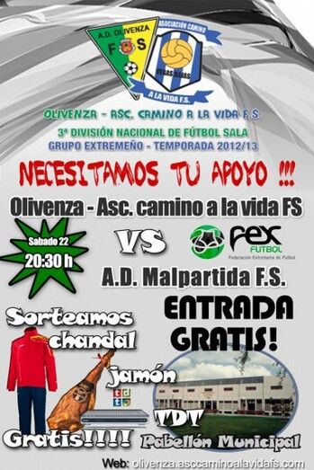 Este sábado día 22, a las 20:30 horas en el pabellón de Olivenza, se disputa el partidazo, entre Olivenza_ASC Camino a la Vida FS – Malpartida (Cáceres) cuarto y quinto clasificado empatados a puntos, y dos de los favoritos para ganar la liga.
