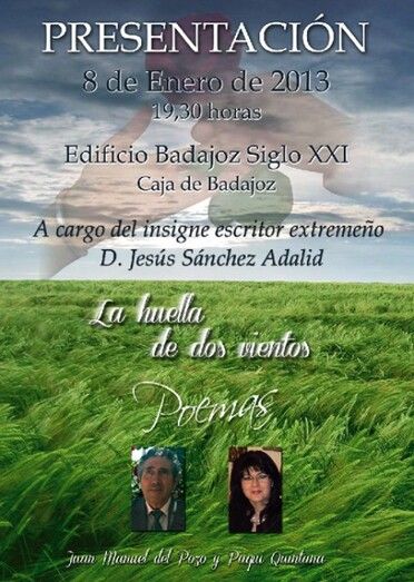 El escritor Jesús Sánchez Adalid presentará próximamente en Badajoz el libro de poemas, “La huella de dos vientos” de Juan Manuel del Pozo Jiménez y Paqui Quintana Vega. El evento tendrá lugar en el edificio Badajoz Siglo XXI de Caja Badajoz el día 8 de enero a las 19`30h. La obra, que fue mostrada recientemente en Montijo, tiene dos partes diferenciadas y contiene una selección de los mejores poemas de la carrera literaria de ambos autores. Entre ello se incluyen poemas ganadores de certámenes convocados a nivel regional y nacional. Más de cuarenta sonetos, dan una idea de la predilección de Juan Manuel y Paqui por las estrofas clásicas, aunque podemos encontrar entre sus páginas alguna muestra del verso libre.