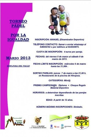 Este torneo se enmarca dentro del programa de actividades para conmemorar el Día de la Mujer. En esta primera edición para inscribirse podrá enviarse por Whatsapp al 646694182 o a través del 924520975 con Manuel, Dinamizador Deportivo, una cuota de inscripción de 4 euros por pareja. Las fechas recogen del viernes 8 al 9 de marzo sábado. En cuanto al sorteo en éstas categorías Mixta será el jueves 7 de marzo a las 21 horas en el Restaurante de la Piscina de la localidad pacense de Hinojosa del Valle, unos participantes que podrán optar a Diploma+Cheque Regalo Material Deportivo. Fecha límite de Inscripción el miércoles 6 de marzo hasta las 21 horas, los horarios a determinar dependiendo de las parejas inscritas. El número máximo de inscripciones es ilimitado.