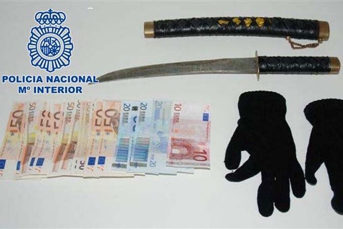 Instantes después, este hombre ha salido de la entidad, procediendo a su inmediata detención, encontrándole entre sus pertenencias una catana de 30 cm. de hoja, con al que amenazó al responsable, unos guantes y un sobre conteniendo el botín sustraído, ascendiendo a 840 €.