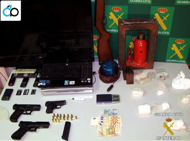 Además de la droga, se interviene material para su manipulación, una prensa hidráulica con moldes para confeccionar tabletas de cocaína, material informático y aparatos de telefonía móvil, así como dos vehículos de alta gama, tres pistolas una de ella simulada, una carabina, munición y un rotativo policial.