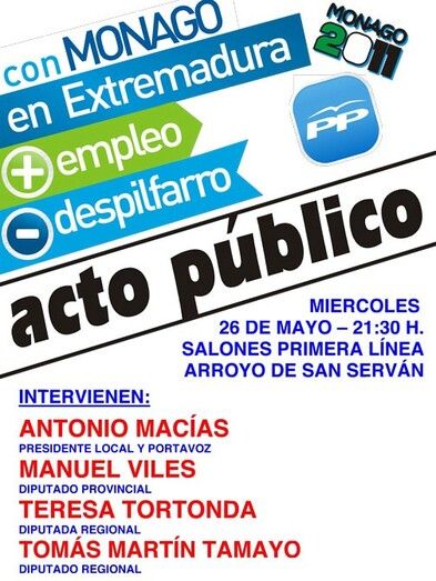 El miércoles 26 de Mayo, el Partido Popular desarrollará la campaña “+ empleo – despilfarro”, en la comarca de Montijo.