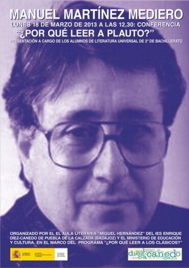 El próximo lunes 18, a las 12,30, tedrá lugar la Charla "Por qué leer Teatro" a cargo del reconocido dramaturgo MANUEL MARTÍNEZ MEDIERO dentro del Aula Literaria "Miguel Hernández" y las Jornadas de Enrique Díez-Canedo, dedicadas a las Representaciones Tatrales en la época de Díez-Canedo.