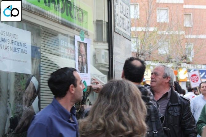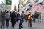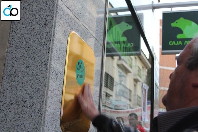 Algunos miembros de la Plataforma pegaron carteles y pegatinas con el lema “Sí se puede” en las cristaleras de Bankia en Montijo. La manifestación rodeando el Ayuntamiento de forma simbólica.