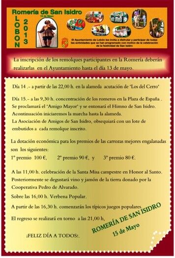 La inscripción de los remolques participantes en la Romería deberán realizarlas en el Ayuntamiento hasta el día 13 de mayo.