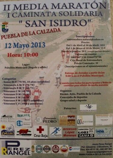 El próximo domingo, día 12 de mayo, se celebrará en Puebla de la Calzada la 2ª edición de la Media Maratón “San Isidro”, la cual este año estará acompañada de una caminata solidaria de 7 km.