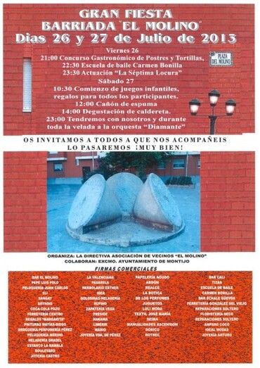 La Barriada de "El Molino", en Montijo, celebra su fiesta los días 26 y 27 de julio. Las actividades empiezan el 26 a las 21:00 horas con un concurso gastronómico de postres y tortilla, actuación de la Escuela de Baila Carmen Bonilla y de “La Séptima Locura”.