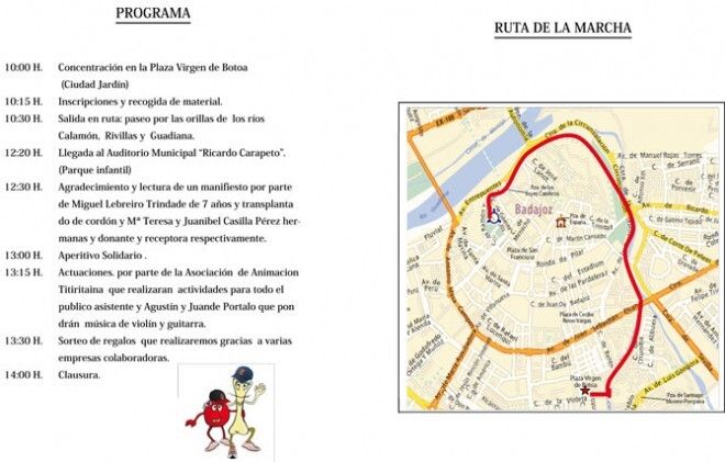 La marcha solidaria, que será un evento de convivencia, se celebrará entre la plaza de la Virgen de Bótoa y el auditorio municipal Ricardo Carapeto. Los asistentes pasearán por las orillas de los ríos Calamón, Rivillas y Guadiana hasta llegar al auditorio.