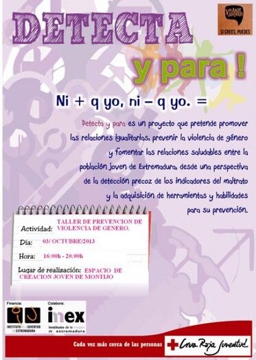 Este proyecto pretende incidir en la prevención de la violencia de genero entre la población juvenil de Extremadura. Por ello, Cruz Roja Juventud Montijo, plantea una intervención socioeducativa, que permita dotar a los y las jóvenes los recursos y habilidades necesarias para hacer frente a estos casos, y crear además, unos indicadores básicos de detección precoz, que permitan a cualquier persona, dentro de su pareja, detectar posibles problemas de violencia de genero, utilizando para ello como base la intervención de los propios jóvenes, capacitados y preparados para trabajar la sensibilización.