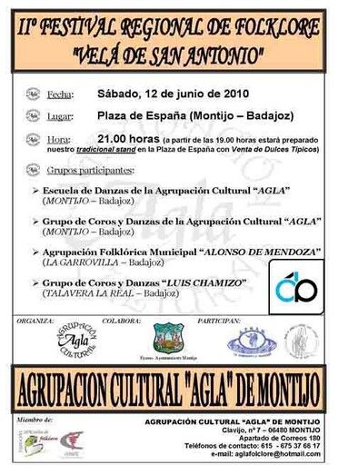 El sábado 12 de junio, desde las 21:00 horas, en la Plaza de España de Montijo se celebra el II Festival Regional de Folklore Velá de San Antonio, organizado por la Agrupación Cultural ALGLA.