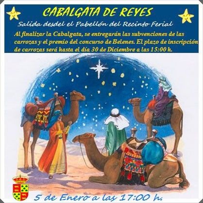 El 5 de enero a partir de las 17:00 horas tendrá lugar la Cabalgata de Reyes, con salida desde el Recinto Ferial. Los premios del concurso de Belenes se entregarán al finalizar la Cabalgata.