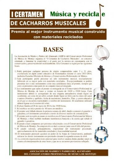 La asociación de Madres y Padres del Alumnado (AMPA) del Conservatorio Profesional de Música de Montijo organiza el “I Certamen de Cacharros Musicales”, un concurso orientado a fomentar la creatividad y el gusto por la música en consonancia con la conservación y preservación del medioambiente. Este Certamen se regirá por las siguientes bases.