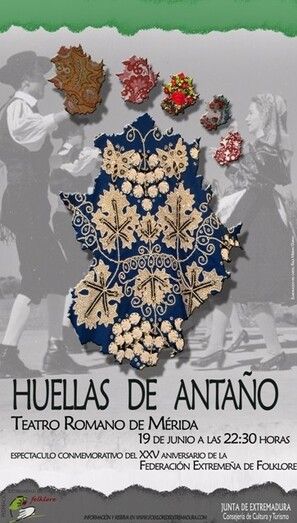 El próximo sábado día 19 de Junio, con motivo de la conmemoración del 25º Aniversario de la Federación Extremeña de Folklore se celebrará un Espectáculo denominado “Huellas de Antaño” en el Teatro Romano de Mérida.