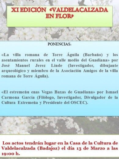 La primera correrá a cargo de José Manuel Jerez Linde, investigador y miembro de la Asociación Amigos de la villa romana de Torre Águila, bajo el título “La villa romana de Torre Águila (Barbaño) y los asentamientos rurales en el valle medio del Guadiana”. Y la segunda a cargo Ismael Carmona García, Presidente de la OSCEC, que hablará sobre Estremaúra “El estremeñu enas Vegas Baxas de Guadiana”.