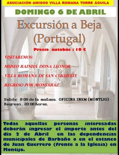 La Asociación Amigos de Torre Águila organiza una excursión a Beja (Portugal), donde se visitará el Museo Rainha Dona Leonor y la Villa Romana de San Cucufate, realizando el regreso por Monsaraz.