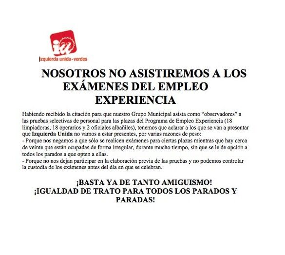 El Grupo Municipal de IU-Verdes en Montijo señala que no estarán presentes como observadores en las pruebas selectivas de personal para las plazas del Programa de Empleo Experiencia que tendrán lugar en Montijo.
