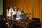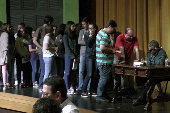 Después de más de una hora de ininterrumpida y seductora exposición, y tras contestar las cuestiones planteadas por los alumnos, llegó el tiempo de la firma de libros, donde Lorenzo Silva volvió a mostrarse cercano y generoso con sus lectores. Para finalizar, el Centro le entregó un recuerdo conmemorativo, a lo que siguió una cálida y entusiasta ovación de los presentes, alumnado del Centro y también miembros del club de lectura de la biblioteca de Montijo que habían sido invitados al acto.