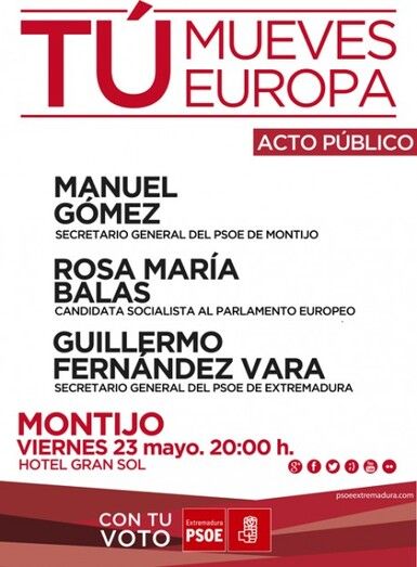 El viernes 23 de mayo, el Partido Socialista organiza un acto público en Montijo con el que se cierra la campaña para las elecciones europeas.