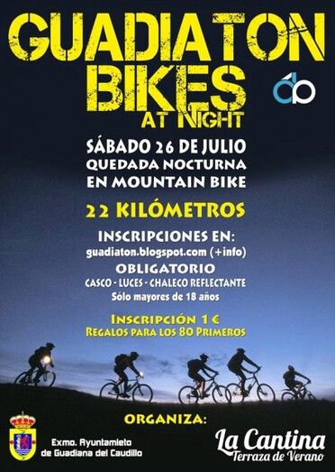 El Ayto. de Guadiana del Caudillo, a través de su Servicio de Dinamización Deportiva junto con la colaboración de la Cantina de la Piscina de Guadiana, organizan una quedada nocturna en Mountain Bike: Guadiatón Bikes, que tendrá lugar el próximo sábado 26 de julio de 2014.
