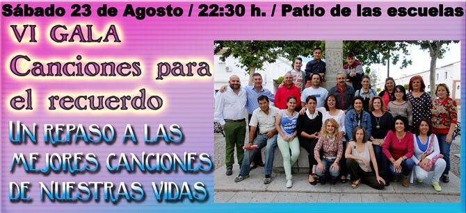 El próximo sábado 23 de agosto a las 22:30 h., en el Patio de las escuelas viejas de Guadiana del Caudillo, podremos disfrutar de la VI Gala "Canciones para el recuerdo", en la que artistas de nuestro pueblo harán un repaso por las mejores canciones de nuestras vidas.