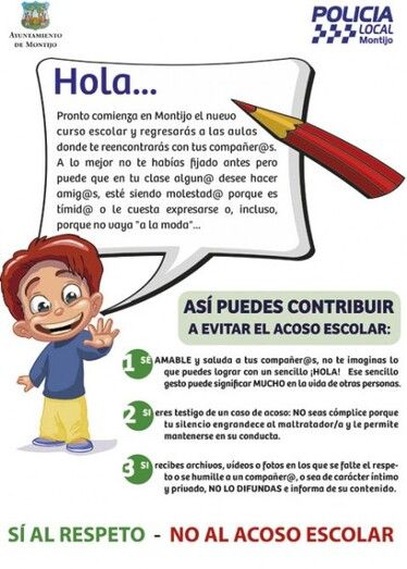 El Ayuntamiento de Montijo va ha desarrollar una campaña de prevención al 'Acoso Escolar' durante el curso 2014/2015, con la que incrementará las acciones desarrolladas por técnicos de la Policía Local de esta localidad frente a conductas de este tipo. Este viernes, coincidiendo con el comienzo del curso escolar, la Policía Montijo ha iniciado una serie de acciones "de carácter educativo-preventivo" dirigidas a los escolares. Estas acciones comienzan con una serie de consejos "contenidos en distintos carteles y flyers que se pondrán a disposición" de los menores, y "cuyo objetivo es sensibilizar sobre el problema del "bullying" o "acoso escolar".