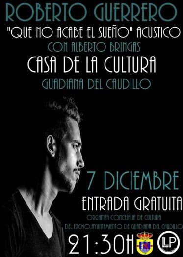 El próximo domingo 7 de diciembre, a las 21:30 horas, podremos disfrutar en la Casa de la Cultura de Guadiana de un gran concierto de Roberto Guerrero, acompañado de Alberto Bringas.