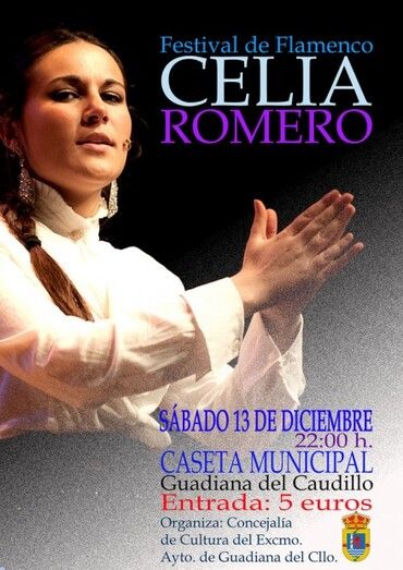 El próximo sábado 13 de diciembre a las 22:00 horas, en la Caseta Municipal de Guadiana del Caudillo, podremos disfrutar de un Festival de Flamenco a cargo de la cantaora Celia Romero.