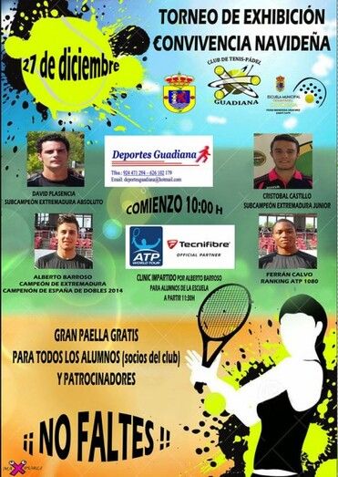 El próximo sábado 27 de diciembre, a partir de las 10:00 horas, tendrá lugar en el Pabellón Municipalde Guadiana un torneo de exhibición y una convivencia navideña de la Escuela Municipal de Tenis-Pádel y el Club de Tenis-Pádel Guadiana.