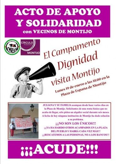 El lunes 19 de enero a las 18:00 horas, la Plaza de España de Montijo acoge la visita del Campamento Dignidad en un acto de apoyo y solidaridad a unos vecinos de la localidad que se encuentran acampados bajo los soportales del Ayuntamiento solicitando un alquiler social durante 6 meses, ya que señalan que son solicitantes de la renta básica que no les acaba de llegar y que a fecha de hoy ninguna institución ha dado solución a sus problemas.