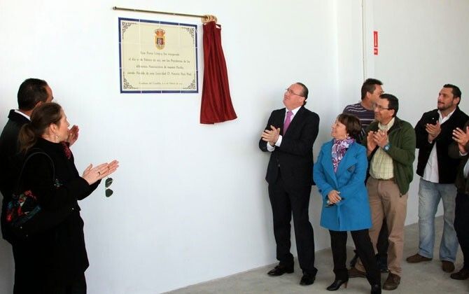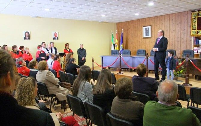 A las 13:00 h., las mismas autoridades y asistentes llevaron a cabo la inauguración del nuevo salón de plenos, situado en las traseras de la Calle del Cine. En el acto institucional presidido por el alcalde de  Guadiana,D. Antonio Pozo Pitel, estuvo presente también uno de los anteriores alcaldes de nuestro pueblo, D. Agustín Gallego Barrena. Por su parte, debido a motivos de salud y familiares, no pudieron personarse en el acto D. Gregorio Escobar Suárez y Dña. Concepción Lebrato Plaza, ex alcaldes también de Guadiana. No obstante, los cuatro alcaldes de la democracia en nuestro pueblo están presentes en el nuevo salón de actos con sus respectivas fotografías. El párroco bendijo el salón, recordando que es un lugar importante para Guadiana ya que en él se tomarán decisiones trascendentales para nuestro día a día. Y, tras ello, tuvo lugar una actuación de la Rondalla.