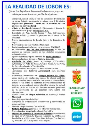 El actual alcalde de Lobón y candidato a renovar la Alcaldía del PP en Lobón, Roberto Romero, presenta un boletín informativo en el que expone lo realizado a lo largo de la presente legislatura y añadiendo al finalizar el mismo el lema: “Una cosa es DECIR y otra muy diferente HACER”.