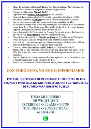 Romero añade también un número de teléfono donde los ciudadanos pueden dirigirse a él con opiniones, propuestas y sugerencias a través de llamadas o de Whatsapp.